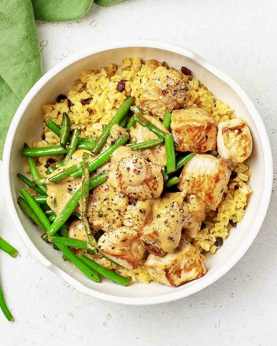 Обед с рисом, курицей и стручковой фасолью